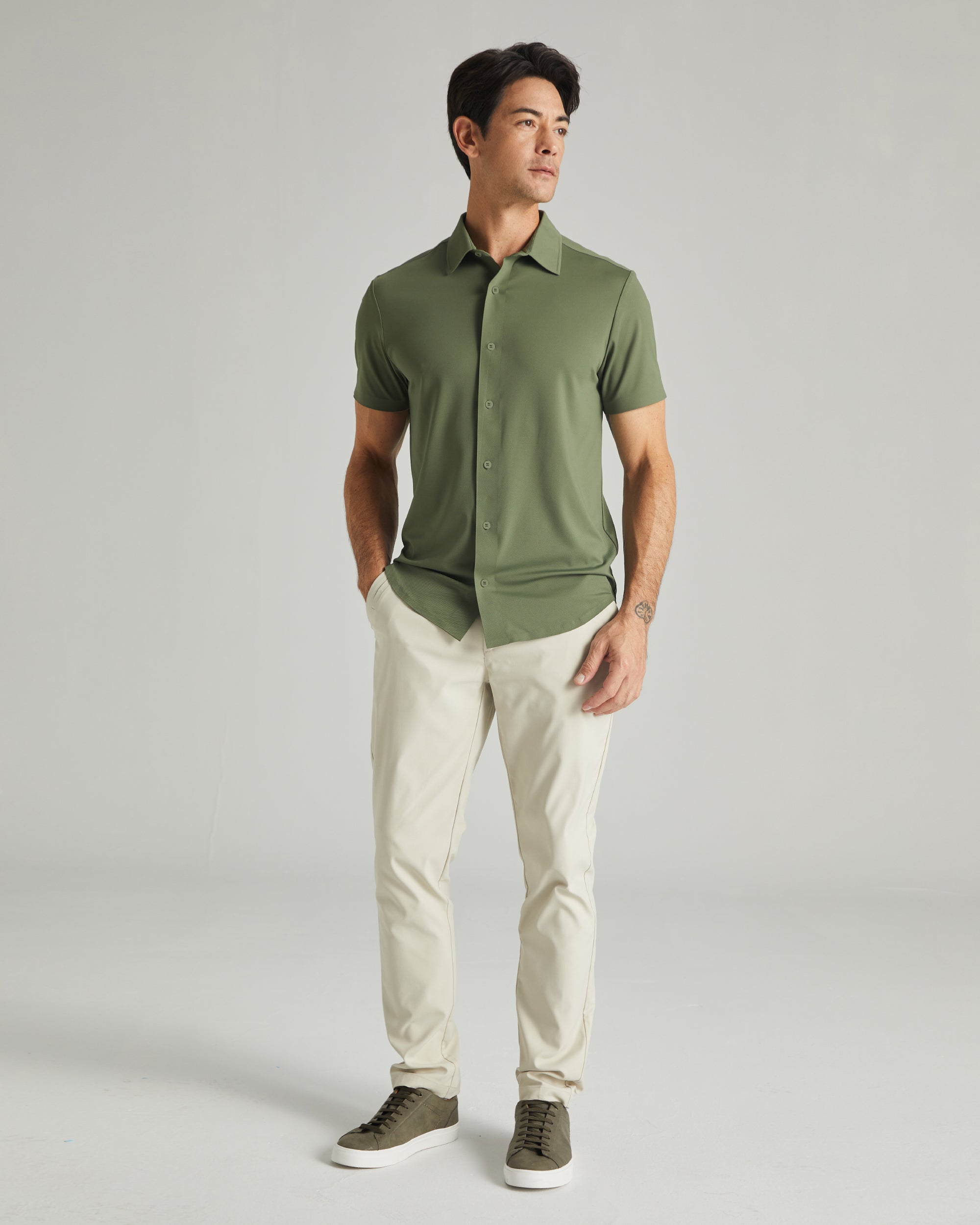 Our Cool Tech Button Front Shirt can handle any occasion. Stretchy, seamless construction creates an extra-smooth and clean finish.